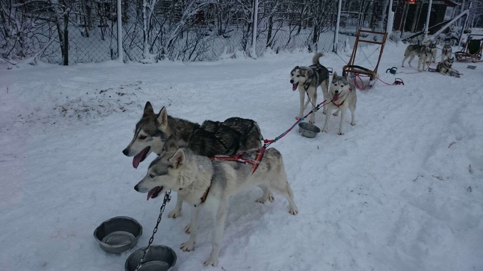 Für ein Wochenende haben wir eine Hundeschlittentour geplant. Früh am Morgen machen wir uns mit dem gemieteten Wagen auf den Weg in das etwa 50km entfernte Dorf. Doch zuerst muss das Auto von Schnee und Eis befreit werden! – Ja hier liegt bereits Schnee 😉 Hundeschlittentour Schweden Nach einer guten Stunde Autofahrt und einer kleinen Verirrung sind wir dann an dem richtigen Gebäude angelangt. Wir wurden freundlichen empfangen und zum Außengehege geführt, in dem sich die Sibirischen Huskys befinden. Voller Vorfreude bellten diese bereits lautstark. Wir hatten das Gefühl, das jeder der Auserwählte sein wollte. Jessie und ich bekamen jeder einen eigenen Hundeschlitten mit anfangs je drei Huskys. Nach dem Anleinen der Tiere an die Schlitten und Anweisungen zum Steuern und – ganz wichtig – Bremsen ging es los. Vor uns her fuhr der Besitzer mit seinem Schlitten. Da es erst einen Tag zuvor zu schneien begonnen hatte und somit nicht genug Schnee für eine Tour durch den Wald war, ging es über anliegende Felder. Das Gelände liegt äußerst günstig für solchen Touren auf der einen Seite ist der Wald und auf der anderen weite Felder, in die der Besitzer bereits Schlittenspuren eingepfercht hatte. Nach einigen Runden haben wir eine kurze Pause eingelegt, damit die Hunde etwas trinken konnten. Währenddessen bekamen wir einen vierten Hund dazu. Das Vergnügen ging weiter. Am Ende der Tour waren nicht nur die sowohl die Hunde sondern auch wir erschöpft. Zum Abschluss gab es ein traditionelles Mittagessen mit Rentierfleisch draußen am offenen Feuer. Diese Tour war wirklich überwältigend – auch wenn wir keine Waldtour machen konnten. Die Freude über diesen Ausflug beflügelte uns noch Tage …